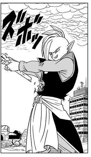 Trunks lucha tenazmente contra Goku Black e incluso logra herirlo, pero aparece Zamasu y usa sus poderes restauradores para curar el daño.