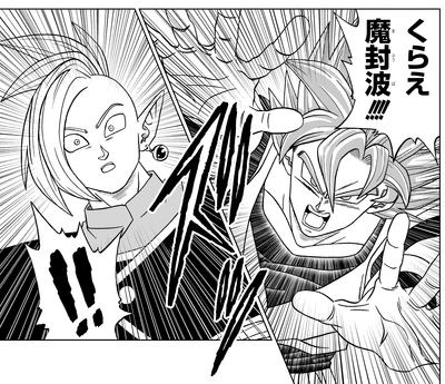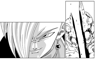 En un último esfuerzo por derrocar a esta fuerza de destrucción diabólica y santurrona, Goku desata el Mafu-ba para sellarlo. Si bien parece haber funcionado al principio, Goku usó por error el sello incorrecto para la técnica, lo que le permite a Zamasu apenas escapar. A pesar de no poder infligir ningún daño duradero a Zamasu, Goku frustra gradualmente a su enemigo con un aluvión incesante de ataques, lo que hace que Zamasu se fusione con Goku Black usando el Potara.