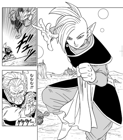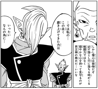 Cuando se le dice que un Supreme Kai siempre debe mantener un alma tranquila y gentil mientras observa el universo, Zamasu, aún firme en su creencia de que la fuerza debe usarse para suprimir el mal, responde obstinadamente: "Entonces, ¿por qué... por qué he estado gastando todo este tiempo y esfuerzo para lograr este poder?"