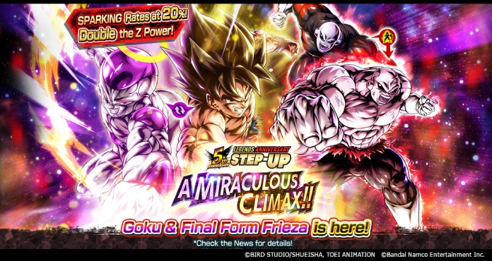 "LEGENDS ANNIVERSARY STEP-UP - A MIRACULOUS CLIMAX!! -" es una invocación increíble en la que obtienes el doble de Z Power en todas las caídas y la tasa de aparición de personajes SPARKING aumenta al 20% en todos los pasos.