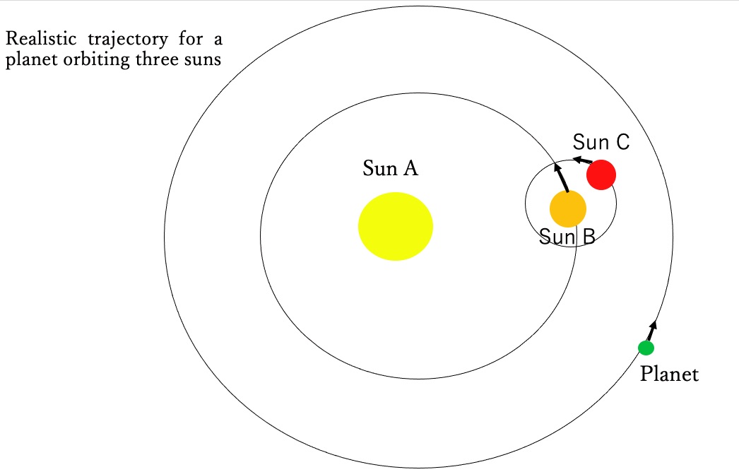 ▲ El segundo más grande de los soles gira alrededor del sol más grande, y el más pequeño de los 3 soles gira alrededor del segundo más grande. Finalmente, los planetas orbitan esos soles.