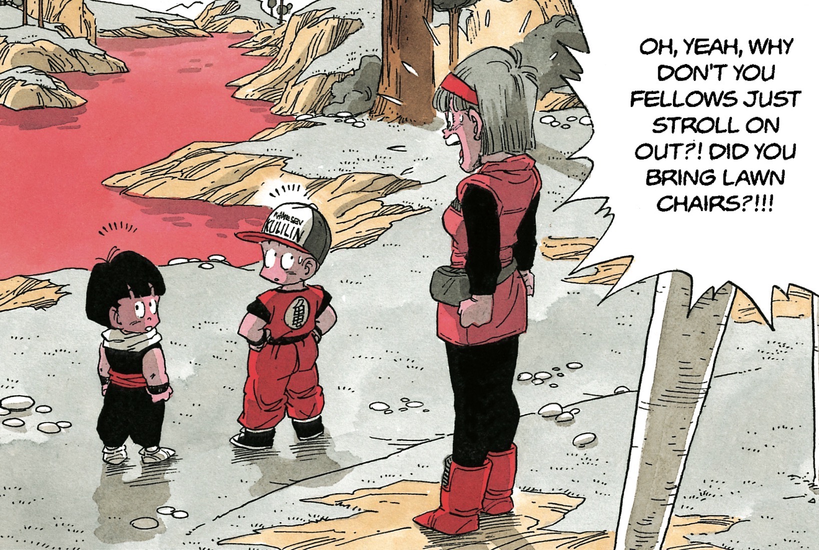 —Para consternación de Bulma, Gohan y Krillin se apresuraron a salir a la superficie del planeta Namek tan pronto como llegaron al mundo alienígena.