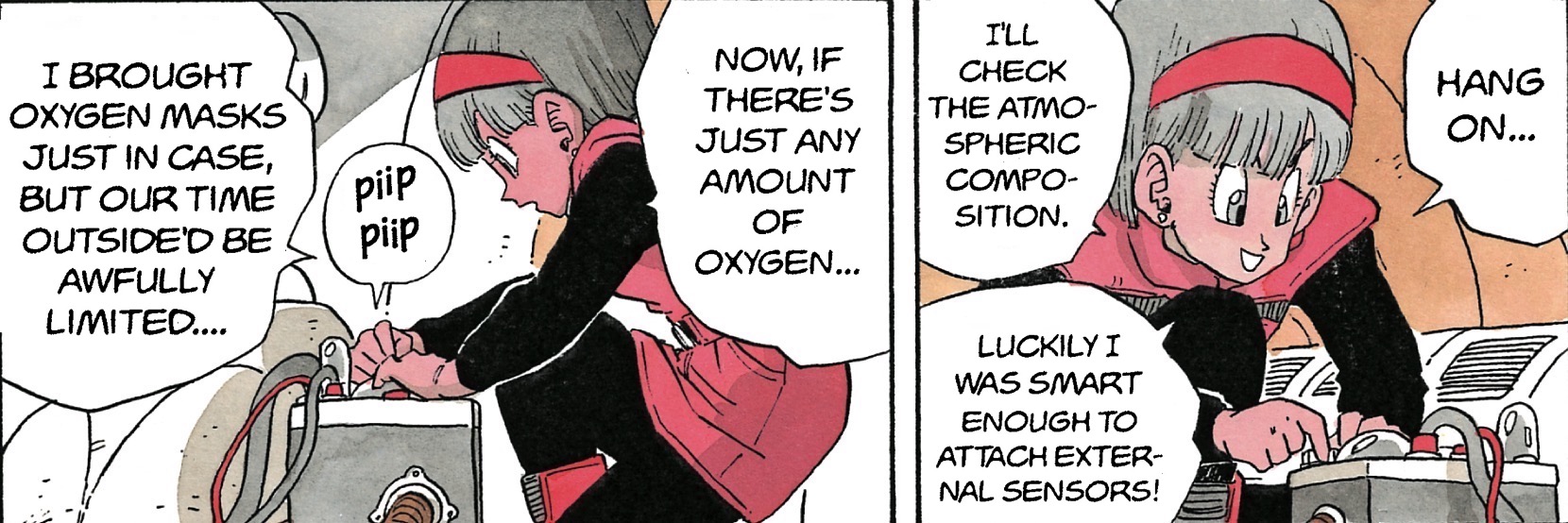 Sekine: Sí, Bulma lo tenía todo bien. (Risas) Incluso cuando llevas a cabo una expedición tripulada, confirmas las condiciones exteriores antes de dejar tu nave espacial, por lo que la escena en la que Bulma pasa por la revisión final es muy realista.