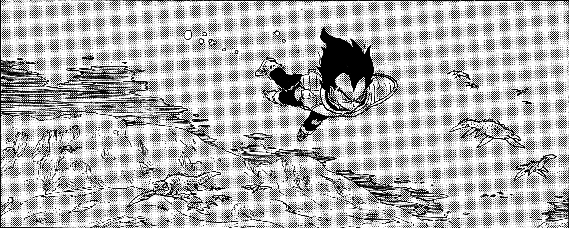 Sekine: Oh, sus paisajes SON realmente similares. Y dado que Gohan, Krillin y los demás pudieron caminar normalmente sobre su superficie, la gravedad en el planeta también debe ser aproximadamente la misma que la de la Tierra.