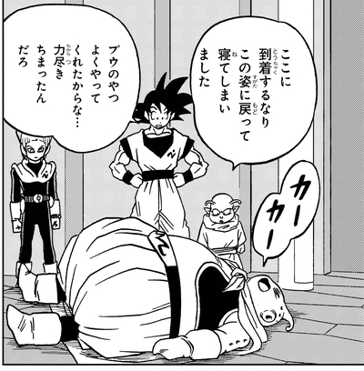 Más tarde, cuando regresa a la nave espacial de la Patrulla Galáctica, el Ki del Gran Supremo Kai finalmente se agota y su forma física vuelve a la de Majin Buu.