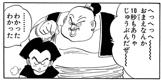 Al ver el tamaño de su oponente, se burla con arrogancia de Krillin, alardeando: "¡Solo necesitaré 10 segundos para ti!".