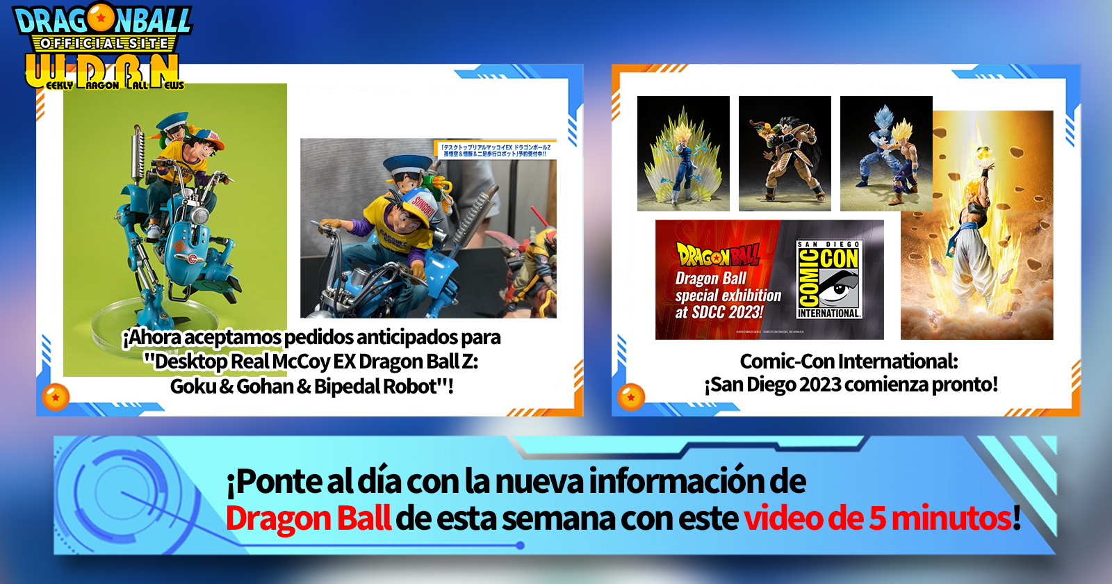 "Noticias semanales de Dragon Ball" es una serie de videos actualizada todos los lunes (JST) para brindarle las últimas noticias en el mundo de Dragon Ball. ¡Únase al editor de V Jump, Victory Uchida, mientras cubre toda la información más reciente publicada la semana anterior, así como nuevas actualizaciones como información de nuevos productos y noticias del sitio para la próxima semana!