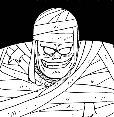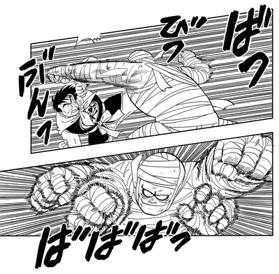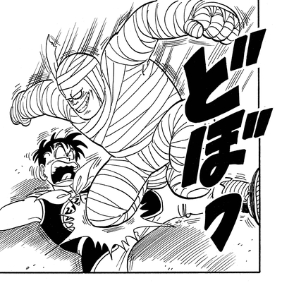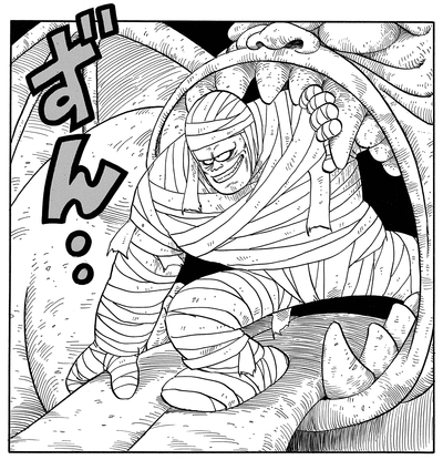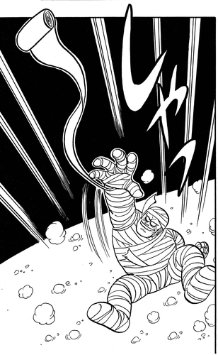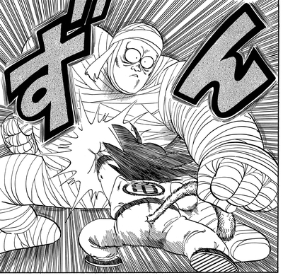 Él dispara un golpe de poder completo al chico, ¡pero no tiene ningún efecto en absoluto! Goku luego responde con un puñetazo que rápidamente derriba a la momia para el conteo.