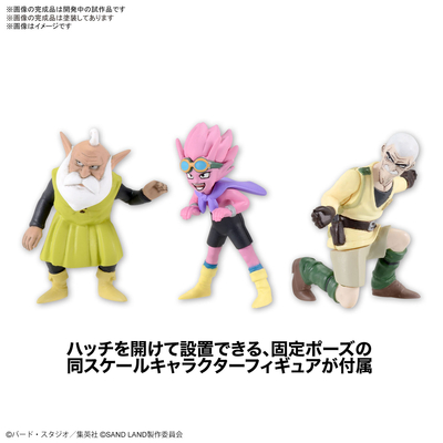 Este modelo también viene con un soporte de exhibición diseñado con el logotipo de SAND LAND , polvo volador e incluso huellas de neumáticos para crear un efecto realmente realista.