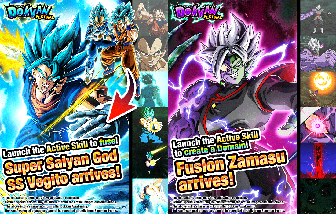 ¡Ambos SSR se pueden despertar con Dokkan en un LR para obtener acceso a sus habilidades activas, cada una con efectos diferentes! Super Saiyan God SS Goku y Super Saiyan God SS Vegeta pueden fusionarse en Super Saiyan God SS Vegito con los de ellos, ¡y Fusion Zamasu tiene la capacidad de desatar la nueva función "Dominio"! Ambas invocaciones en el Festival Dual Dokkan también contarán con una bonificación especial durante las primeras 400 horas después de su lanzamiento: ¡haz 3 invocaciones múltiples para obtener 1 invocación múltiple gratis!
