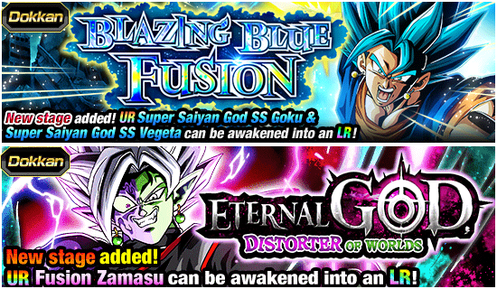 ¡Se han agregado nuevas etapas a los eventos Dokkan "Blazing Blue Fusion" y "Eternal God, Distorter of Worlds"! ¡Supera estos dos eventos para obtener artículos para Dokkan Awakening, los cuatro nuevos personajes SSR disponibles en el Dual Dokkan Festival!