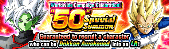 "¡Celebración de la campaña mundial! ¡"50" Invocación especial" está en marcha! Puedes jugar 2 versiones de esta invocación: una que usa cincuenta boletos de invocación especial "50" y otra que se puede jugar con 200 Dragon Stones. ¡Cada versión se puede jugar solo una vez y garantiza 3 personajes destacados y 1 personaje SSR que puede convertirse en Dokkan Awakened en un LR!