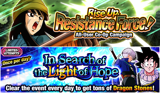 Tampoco querrás perderte la Parte 1 de la campaña cooperativa para todos los usuarios "¡Levántate, fuerza de resistencia!" o "En busca de la luz de la esperanza", un evento de intentos limitados que puedes jugar una vez al día. para conseguir Piedras Dragón! También está el evento de historia "Super Warrior Memorial [Trunks, Fighter of Hope]" donde puedes reclutar a Trunks [Frente a una misteriosa máquina del tiempo] (adolescente), así como otro evento de intentos limitados, "¡End the Tragedy! Future Fighters' Super". ¡Training" que puedes jugar una vez cada 7 días para obtener EX Skill Orbs para tus personajes de la categoría "Future Saga"! ¡Próximamente habrá aún más contenido increíble, así que inicia sesión y juega con todo en estos eventos verdaderamente a escala mundial!