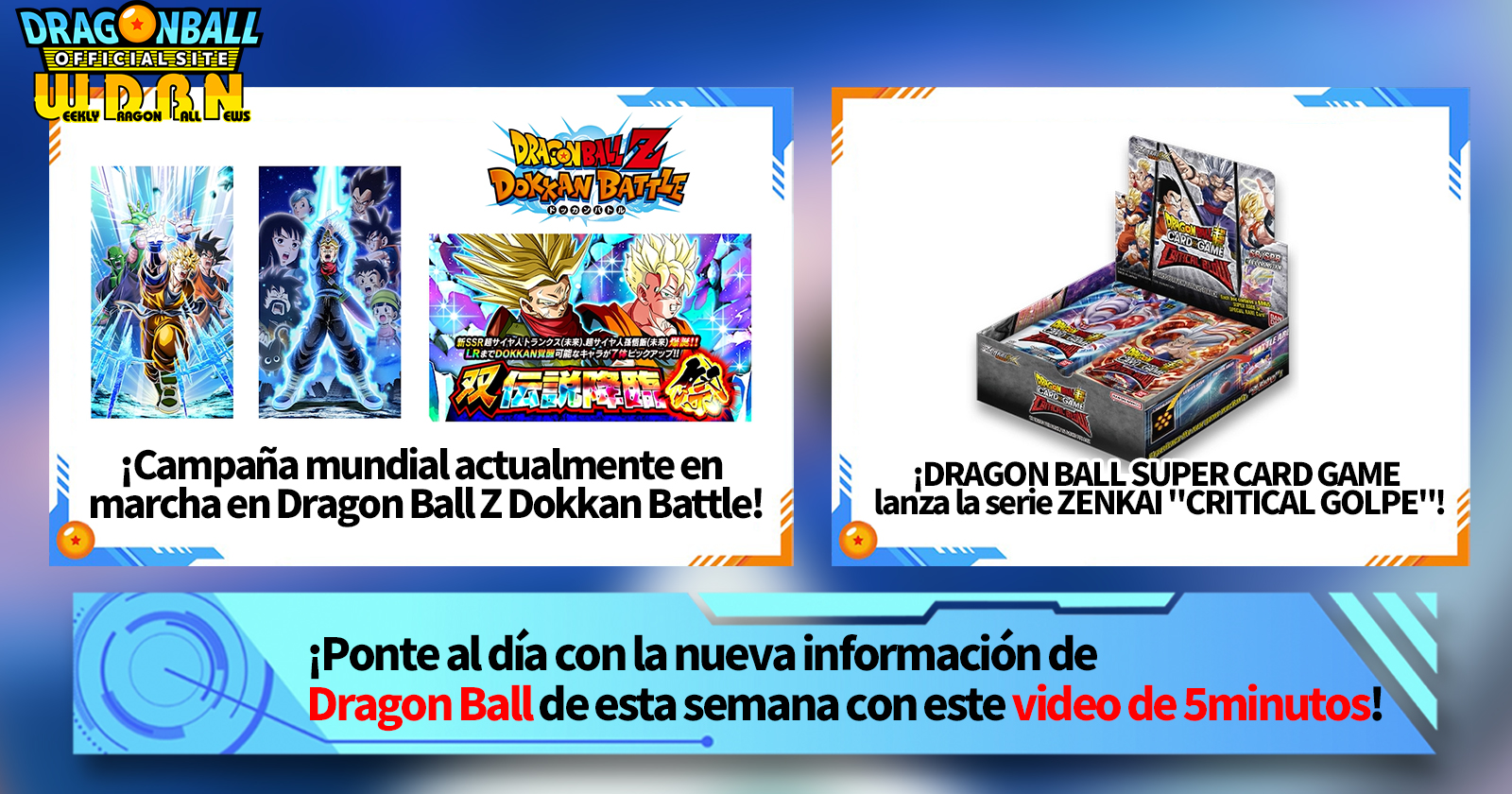 "Noticias semanales de Dragon Ball" es una serie de videos que se actualiza todos los lunes (JST) para brindarte las últimas noticias en el mundo de Dragon Ball. Únase al editor de V Jump, Victory Uchida, mientras cubre toda la información más reciente publicada la semana anterior, así como nuevas actualizaciones como información de nuevos productos y noticias del sitio para la próxima semana.