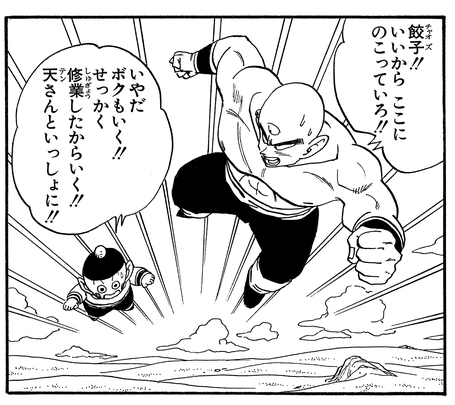 Mientras se dirigen a luchar contra los Saiyajin, Tenshinhan se preocupa por la seguridad de su amigo Chaoz y le dice que se quede atrás.