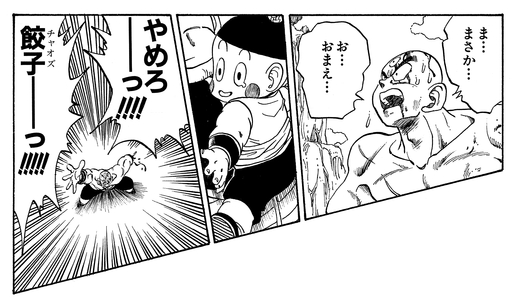 Chaoz ve lo fuera de control que se ha vuelto la situación y decide tomar el asunto en sus propias manos. Para salvar a su mejor amigo, se agarra a la espalda de Nappa y se hace estallar, con el objetivo de llevarse al bruto gigante con él. Sin embargo, el intento finalmente resulta inútil, y ver a su camarada morir ante sus ojos hace que Tenshinhan se enfurezca.