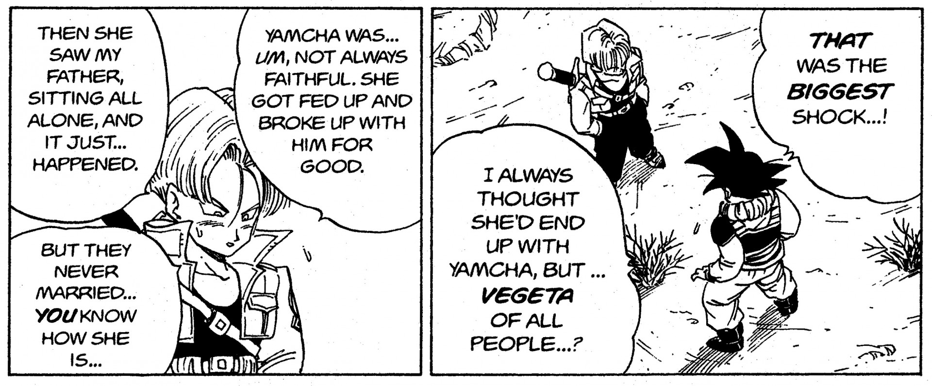 En el arco de Cell , Trunks cuando era adolescente explica que la razón por la que su padre y su madre terminaron juntos fue porque Bulma vio lo solo que se veía Vegeta . Supongo que todavía dudaba entre "intimidad" y "aislamiento", pero al final terminó creando una relación con Bulma.