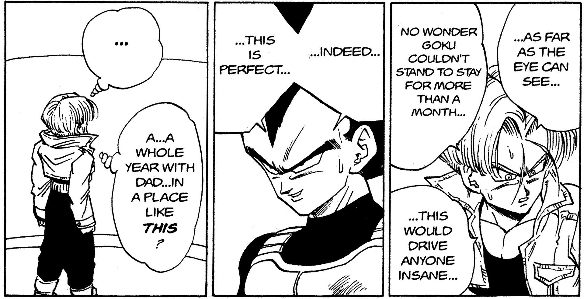 La conciencia de la paternidad crece en alguien a través de la experiencia de, por ejemplo, calmar a un bebé que llora por la noche o encontrar formas de llegar a un acuerdo con un niño que está siendo egoísta. Dado que Future Trunks aparece repentinamente cuando era un adolescente, es natural que Vegeta no tenga ningún sentimiento paternal hacia él.