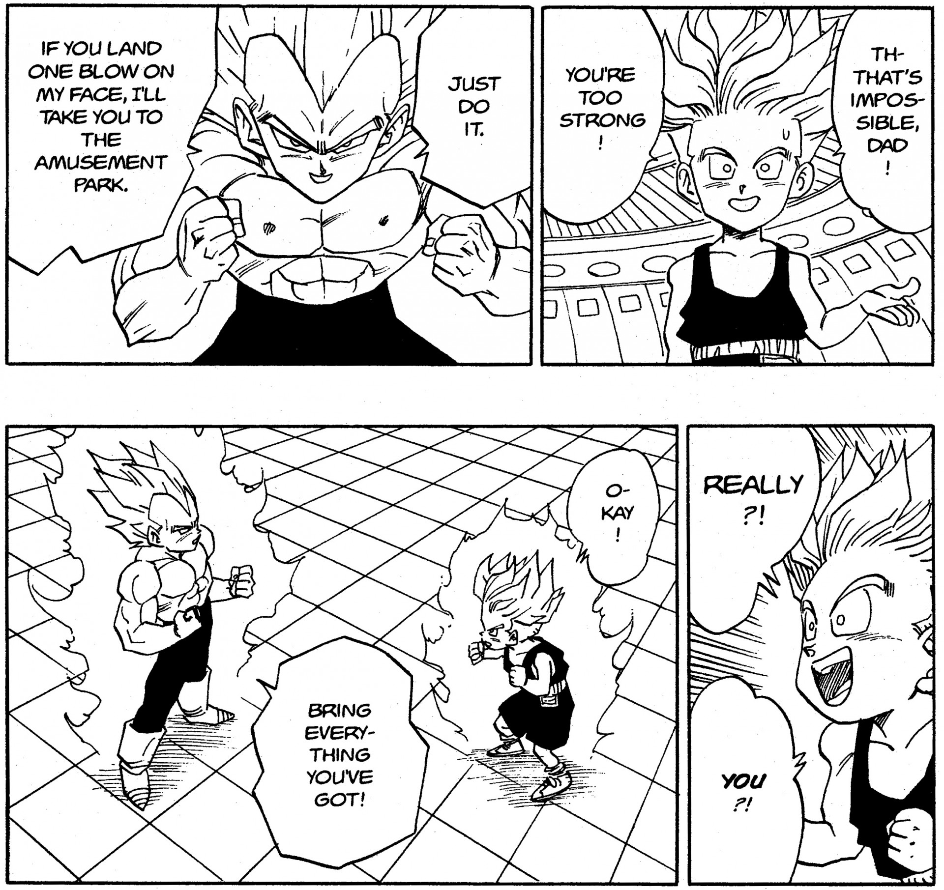 Akamatsu: Parece que sus experiencias durante el arco de Cell le permitieron a Vegeta crecer como padre. Después de hacer la oferta, Trunks responde con bastante entusiasmo. No sólo está feliz por tener la oportunidad de ir al parque, sino que está feliz de que su padre lo acompañe allí. En otras palabras, el joven Trunks tiene un claro afecto por Vegeta.