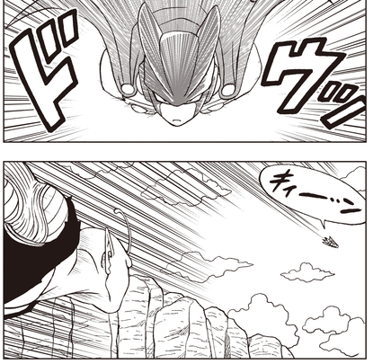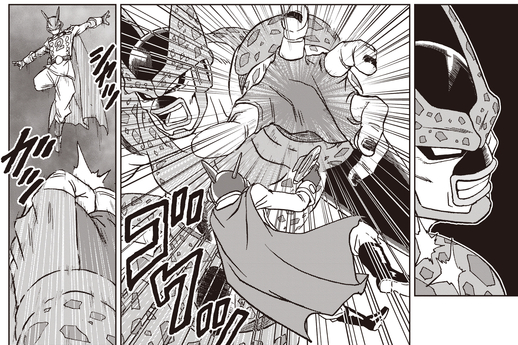 Piccolo, sin perder ninguna oportunidad de atacar durante el ataque, ¡le da un golpe directo en la cabeza! Sin embargo, Cell Max es tan fuerte que no logra causar daños significativos. Aparentemente enfurecido por el impacto, Cell Max desata un ataque indiscriminado con un gran rugido.