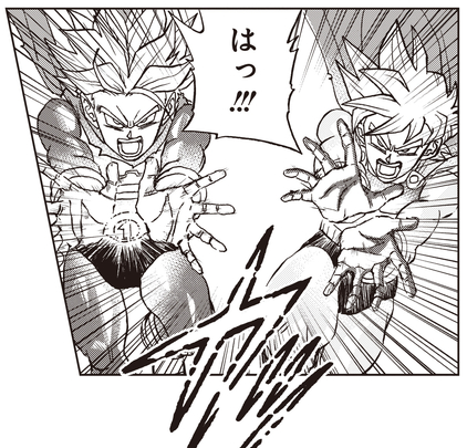 Ahora, en apuros, Trunks y Goten prueban otro truco que tienen bajo la manga al intentar Fusion, ¡pero falla espectacularmente! Este giro de los acontecimientos obliga a Gohan y los demás a unirse a la batalla.