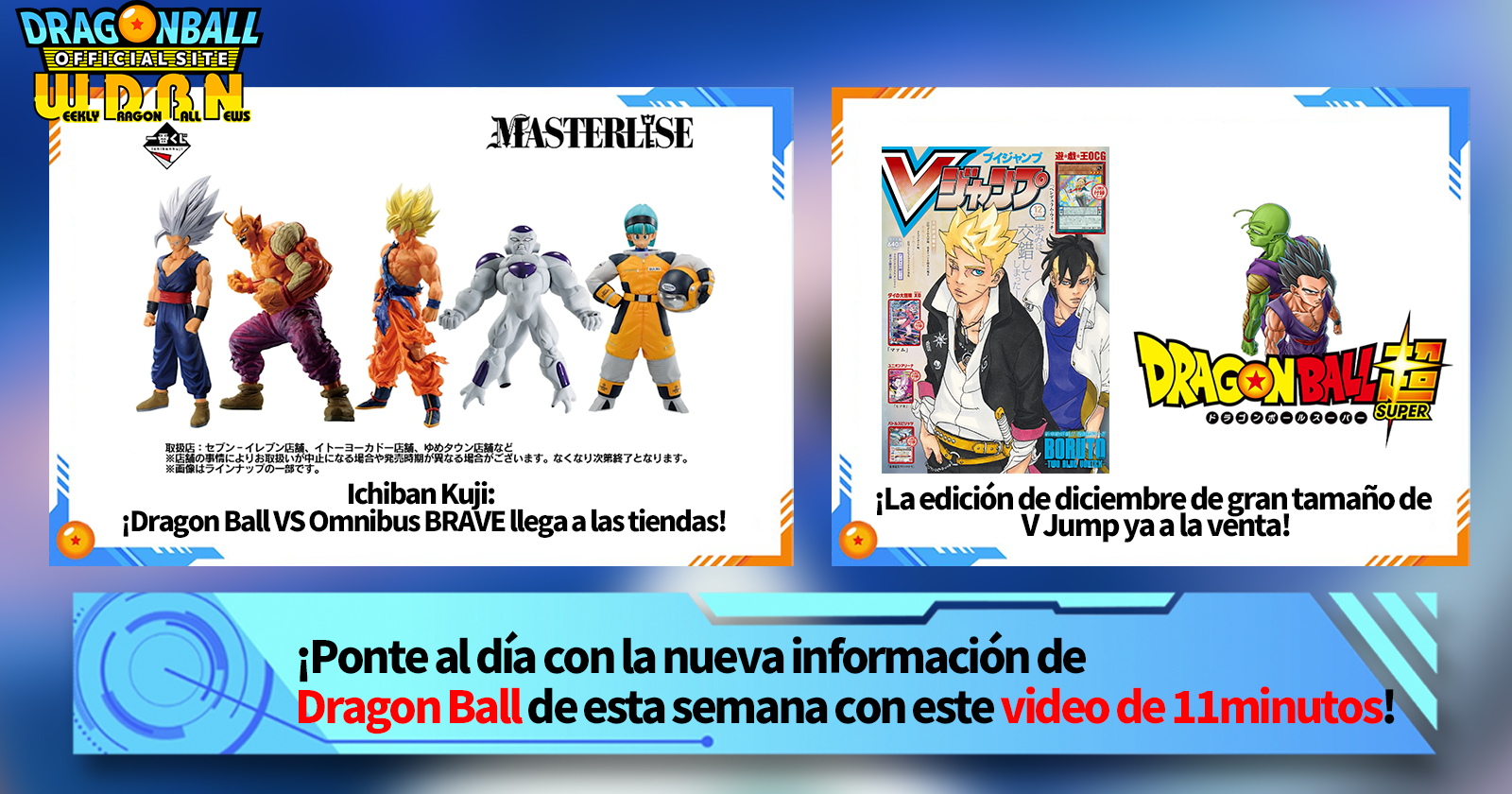 "Noticias semanales de Dragon Ball" es una serie de videos que se actualiza todos los lunes (JST) para brindarte las últimas noticias en el mundo de Dragon Ball. Únase al editor de V Jump, Victory Uchida, mientras cubre toda la información más reciente publicada la semana anterior, así como nuevas actualizaciones como información de nuevos productos y noticias del sitio para la próxima semana.