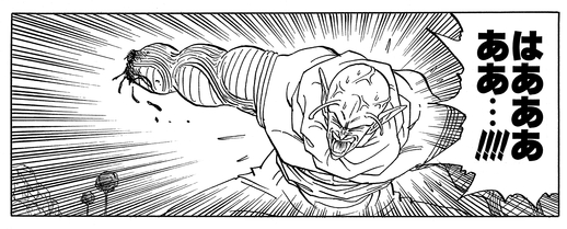 Nail lanza un golpe brutal en el cuello de Frieza, ¡pero se sorprende al descubrir que el ataque no tiene efecto! Frieza luego responde arrancando sin esfuerzo el antebrazo derecho de Nail en una impresionante demostración de poder.