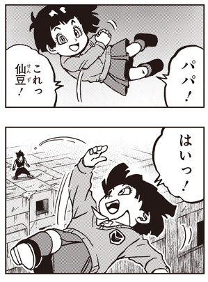 Pan vuela con éxito por primera vez usando Buku-jutsu (técnica de levitación) y le entrega con seguridad el Senzu Bean a Gohan.