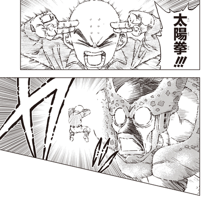 ¡ Krillin , que estaba observando cómo se desarrollaba la pelea, también se une para ayudar! ¡Incluso logra cegar a Cell Max con Taiyo-Ken (Solar Flare)!
