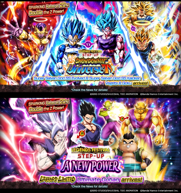 El primero es "LEGENDS FESTIVAL STEP-UP - ¡¡SHOWDOWN!! UNIVERSE 7 -", donde LEGENDS LIMITED Super Saiyan God SS Evolved Vegeta y Super Saiyan God SS Kaioken Goku (DBL65-01S) aparecen como un nuevo personaje de etiqueta.
