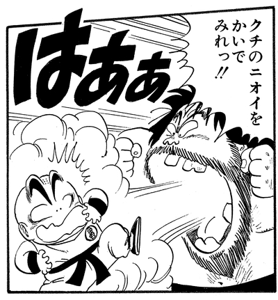 Justo cuando Bacterian está a punto de levantarse, Krillin le da una probada de su propia medicina y se tira pedos en la cara, a lo que el gigante nocivo responde: "M-Mercy..." y pierde la batalla.