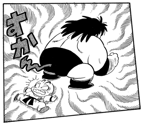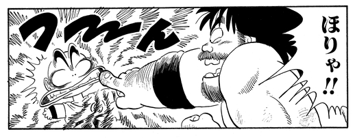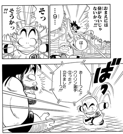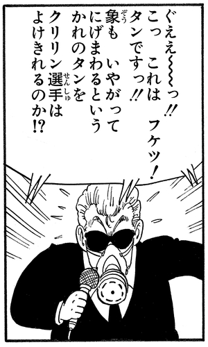 De nuevo en pie, Krillin corre en círculos alrededor de Bacterian, evadiendo lo que el locutor llama "loogies de los que incluso los elefantes huyen con disgusto", ¡y le lanza una patada superpoderosa justo en la cara!