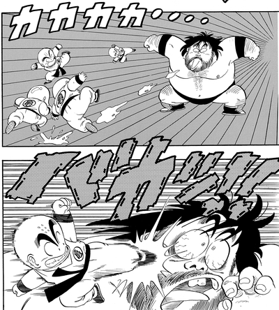Una vez que Krillin está caído e indefenso, Bacterian lanza patada tras patada mientras el árbitro cuenta.