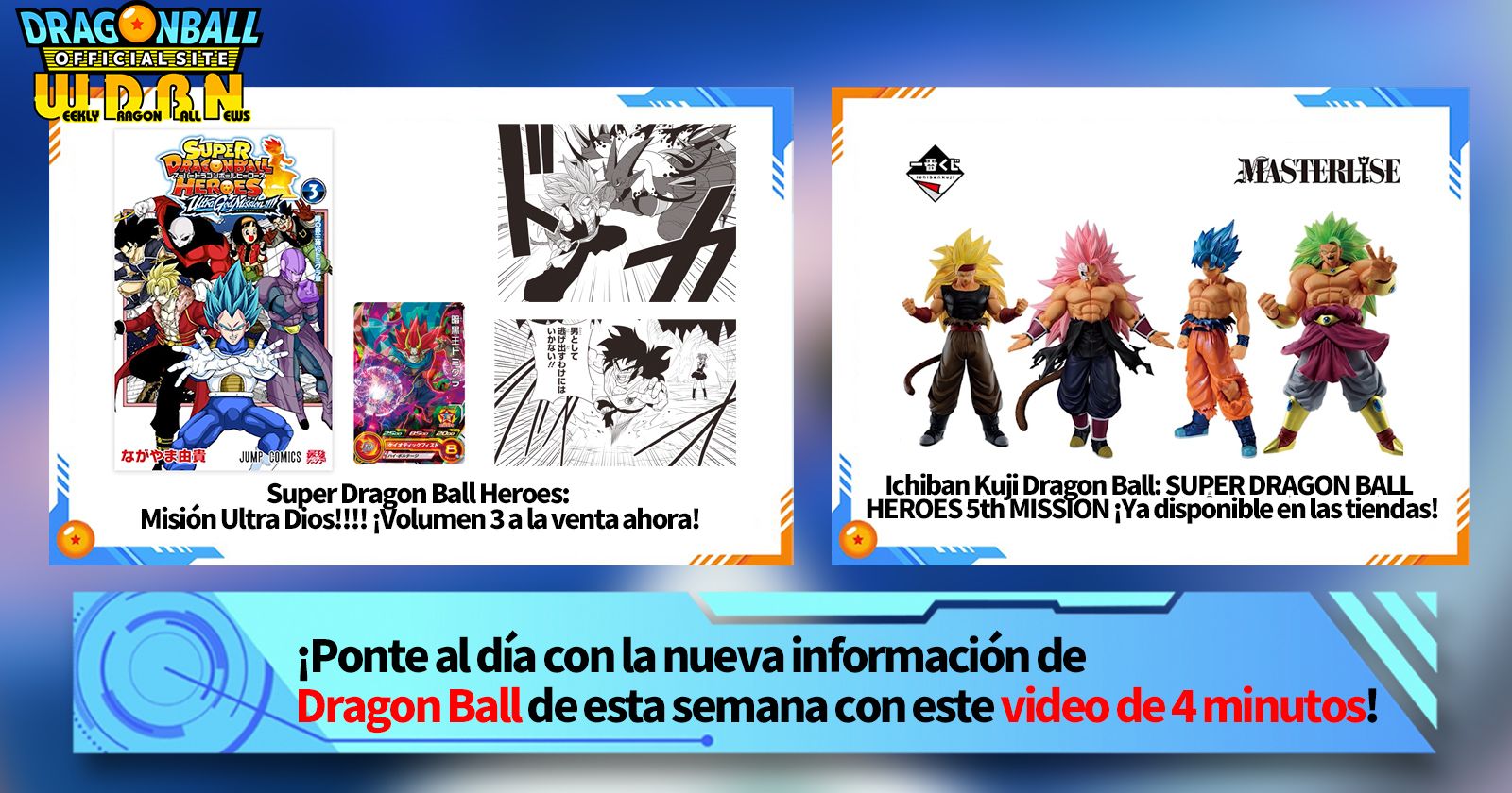 "Noticias semanales de Dragon Ball" es una serie de videos que se actualiza todos los lunes (JST) para brindarte las últimas noticias en el mundo de Dragon Ball. Únase al editor de V Jump, Victory Uchida, mientras cubre toda la información más reciente publicada la semana anterior, así como nuevas actualizaciones como información de nuevos productos y noticias del sitio para la próxima semana.