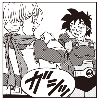 Prometiendo restringir a Cell Max aunque sea lo último que haga, confía el destino de la Tierra a Gohan y se aferra a él con toda su vida.