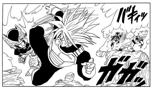 Trunks sube a otro nivel más allá del Super Saiyan y hace todo lo posible contra Cell, pero finalmente admite la derrota cuando se le señala que el poder necesario para soportar esta transformación requiere tanta energía que reduce drásticamente su velocidad.