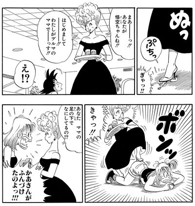 Mientras Bulma le mostraba a Goku los efectos de la Micro-Band , su madre apareció de repente y luego pisó a su hija, que se había reducido a un tamaño más pequeño que los tacones de su madre.