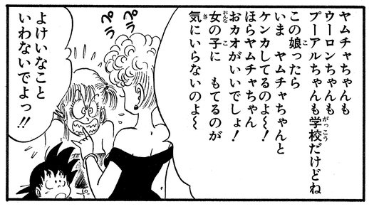 Siguió contándole a Goku todo sobre los negocios de Bulma, como sus peleas con Yamcha, lo que hizo que su hija se pusiera roja.