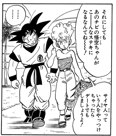 Después de tomar a Goku del brazo, ella lo invita a salir y le dice: "Deberíamos salir a tomar algo... ¡después de que golpeaste a esos Saiyajin!"