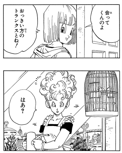 Durante Cell Saga, la madre de Bulma mira a su hija de forma extraña cuando su hija vino y le pidió que la cuidara porque, como explicó Bulma , "¡Voy a ver a mi bebé grande!".
