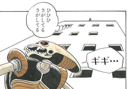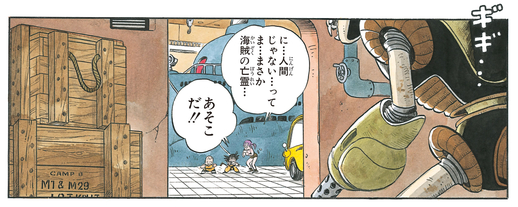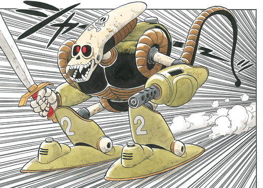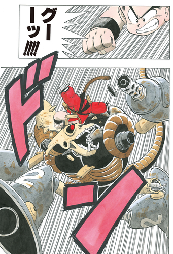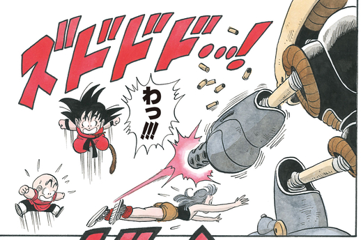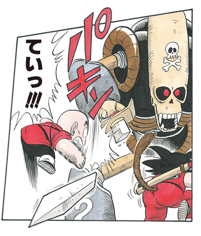El robot dispara una ráfaga de ametralladora con su brazo izquierdo e intenta cortar y trocear a nuestros héroes, pero estos lo esquivan y Krillin rompe sin miedo la espada del Robot Pirata con un golpe bien colocado.