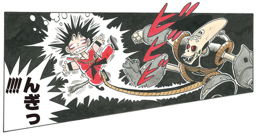 Goku salta del agua para escapar y salta a lo alto de un edificio usando su Nyoibo. Pirate Robot pronto lo sigue en busca de esta posible presa, pero no puede localizar al joven Saiyajin. ¡En medio de la confusión, Goku lanza un devastador ataque de Jan-Ken (Rock) desde lo alto del aire! ¡¡El golpe aterriza directamente en la parte posterior de la cabeza de Pirate Robot, partiéndola en dos y provocando que el robot explote!!
