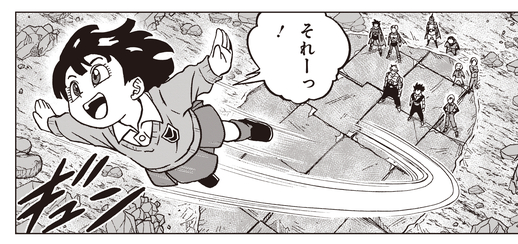 Una vez pasado el peligro, Pan aprovecha la oportunidad para mostrarle a Piccolo su recién dominado Buku-jutsu (técnica de levitación).