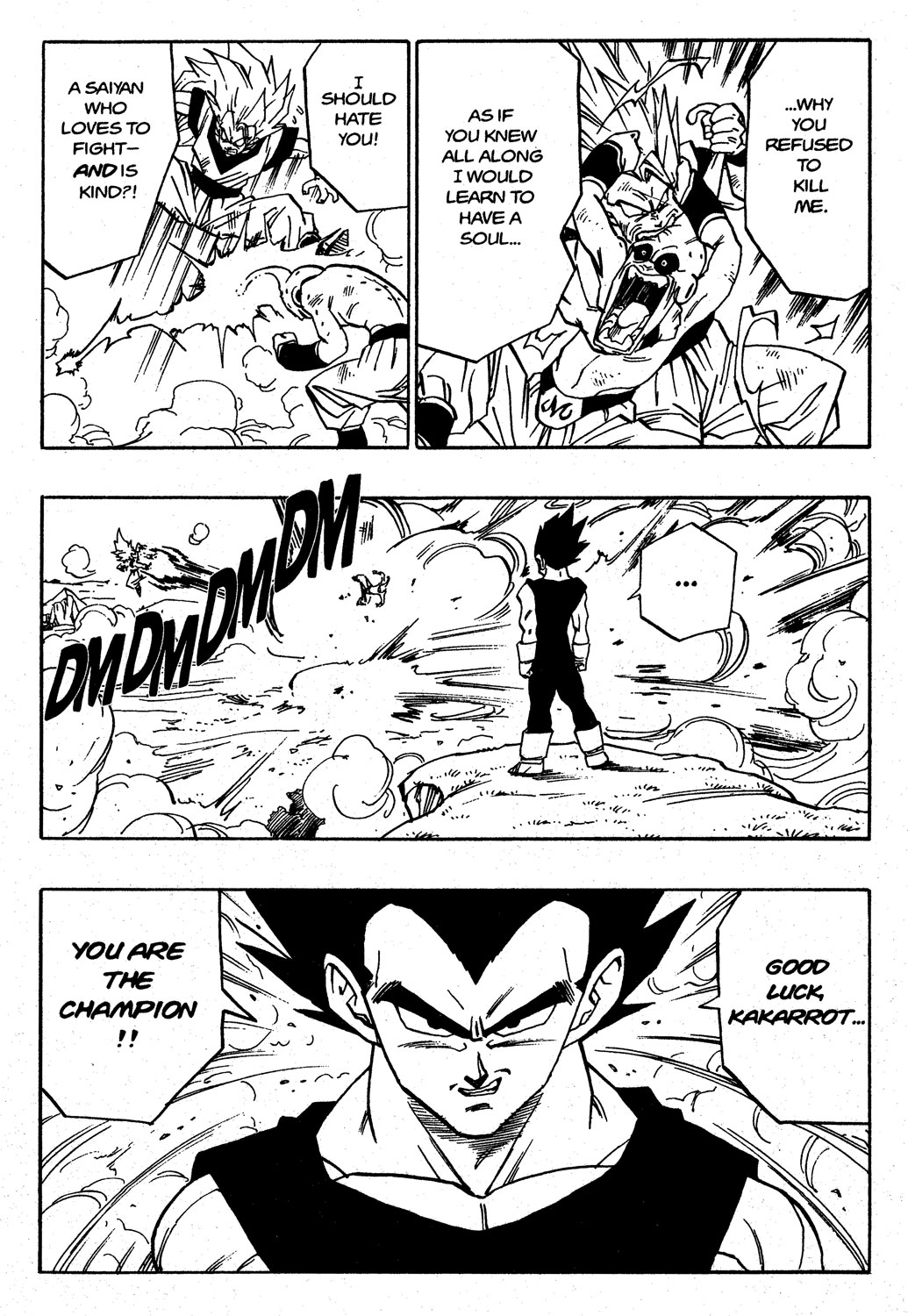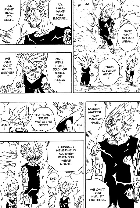 —En términos de pelear juntos, creo que la última batalla, la pelea contra Majin Buu, también fue impresionante. Al pensar en detener a Majin Buu por el bien de Goku y al tener la idea de pedir ayuda a la gente de la Tierra, Vegeta actúa aquí de manera diferente a como lo había hecho en el pasado.