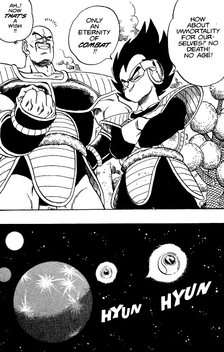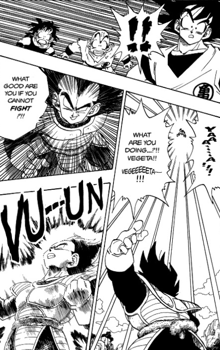 —Primero vemos a Vegeta como un guerrero Saiyajin, una raza violenta de personas que invaden planeta tras planeta con el propósito de venderlos al mejor postor. Uno pensaría que sentiría algún sentido de parentesco con Nappa, un compañero guerrero Saiyajin...