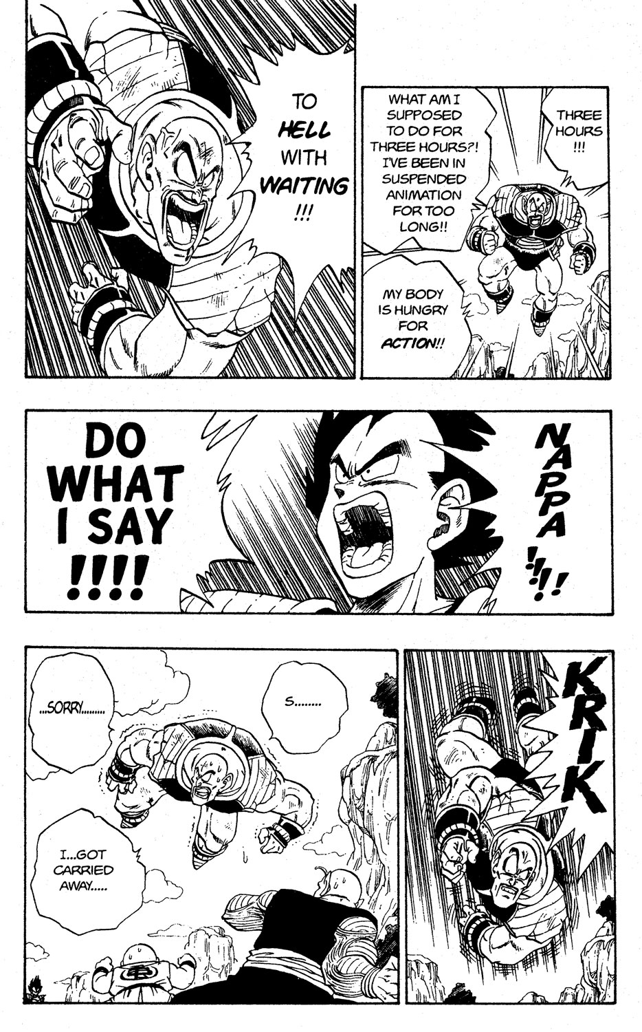 Quizás los pensamientos de Vegeta hacia Nappa podrían resumirse como "Con o sin él, todavía puedo lograr mis objetivos (es decir, robar las Esferas del Dragón de la gente de la Tierra y lograr la inmortalidad)".