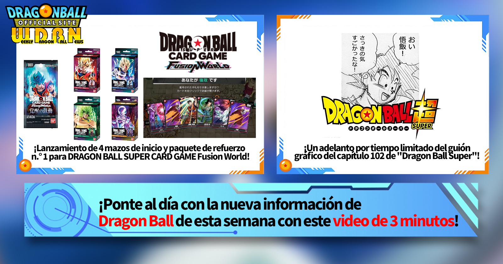 ¡Esta semana, nuestra historia principal es sobre los cuatro mazos iniciales y el paquete de refuerzo n.° 1 que se lanzará para DRAGON BALL SUPER CARD GAME Fusion World el 16 de febrero!