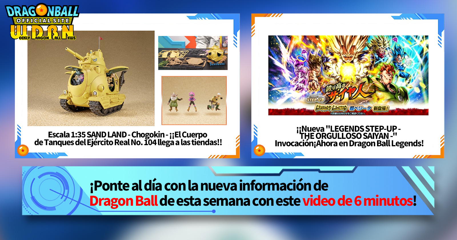 "Noticias semanales de Dragon Ball" es una serie de videos que se actualiza todos los lunes (JST) para brindarte las últimas noticias en el mundo de Dragon Ball. Únase al editor de V Jump, Victory Uchida, mientras cubre toda la información más reciente publicada la semana anterior, así como nuevas actualizaciones como información de nuevos productos y noticias del sitio para la próxima semana.