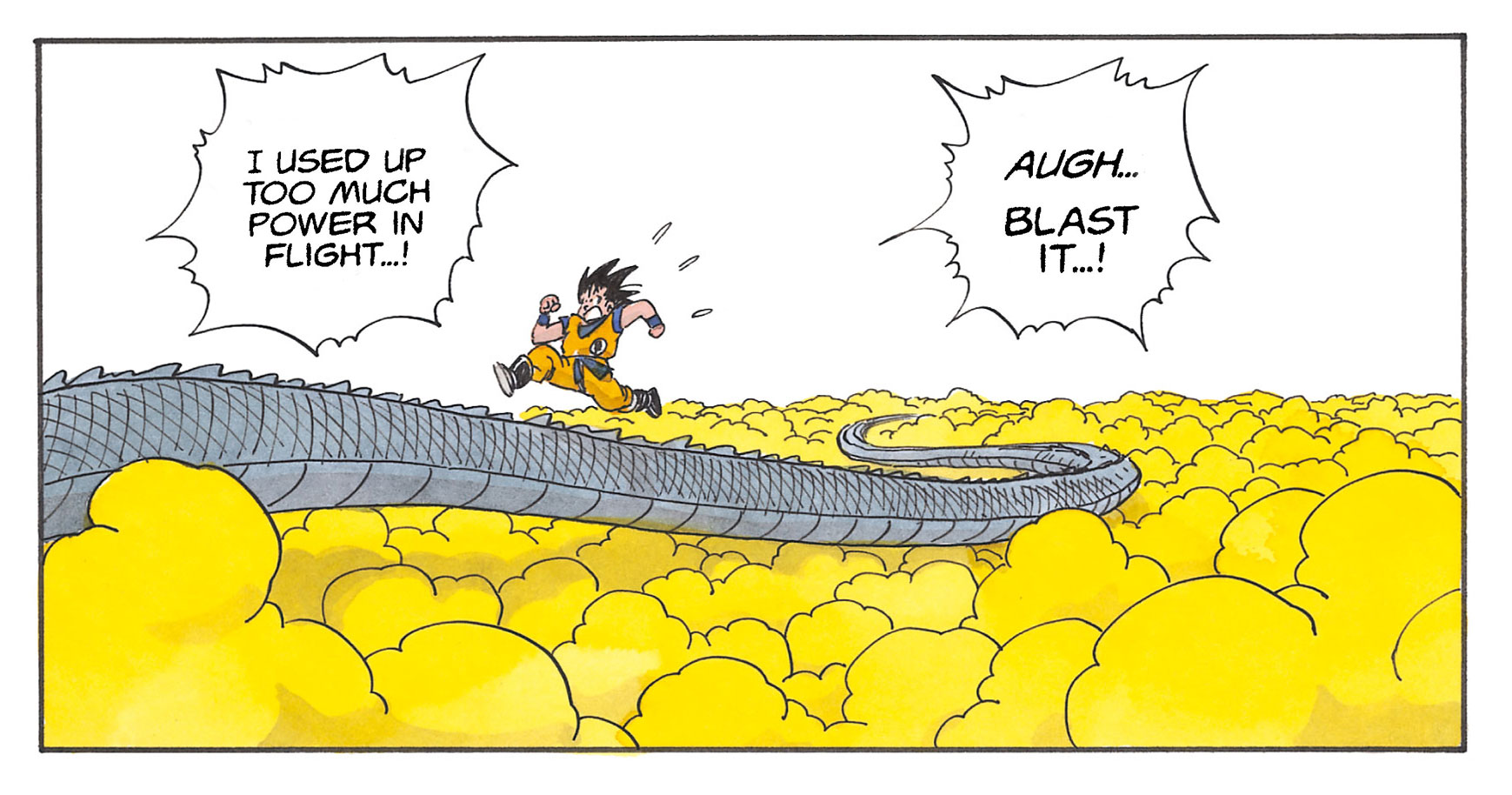 Fumita: Hablando de eso, cuando Goku estaba abordando Serpent Road, al principio estaba viajando a través de Buku-jutsu (Técnica de Levitación), pero después de un rato comienza a correr y dice: "¡Usé demasiada energía en vuelo...!", ¿bien? Recuerdo que cuando vi eso pensé: "Caray, volar debe ser agotador".
