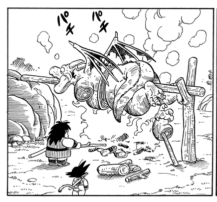 Ikezaki:Otro ejemplo es cuando Goku conoce a Yajirobe por primera vez. El samurái agradablemente regordete corta Cymbal (una de las creaciones del Rey Demonio Piccolo) cuando viene a atacar a nuestros héroes, y luego asa al demonio saurio entero en una brocheta. ¡Se veía tan bien en el manga!